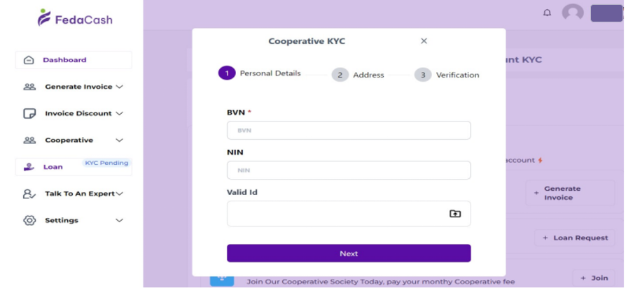 To comply with regulatory requirements and ensure the safety of your account, FedaCash requires that you complete KYC verification before accessing any loan services. Provide your BVN (Bank Verification Number) or NIN (National Identification Number) for identity verification. This step helps us confirm your identity and ensure that your loan application process is secure.