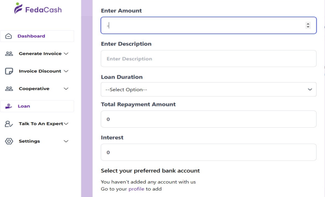 FedaCash will review your loan application and notify you of the approval status. You’ll be informed via email or directly within your FedaCash dashboard.